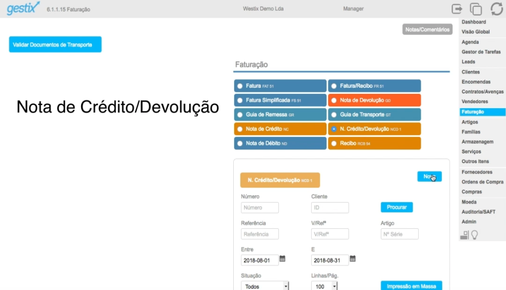 Quando é necessário fazer uma nota de crédito envolvendo devolução de dinheiro ao cliente, começar por visualizar a fatura afetada e clicar na opção Nota de Crédito.
