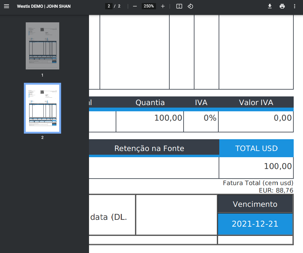 Para emitir uma fatura em USD, proceder como se mostra nos passos seguintes, por exemplo.