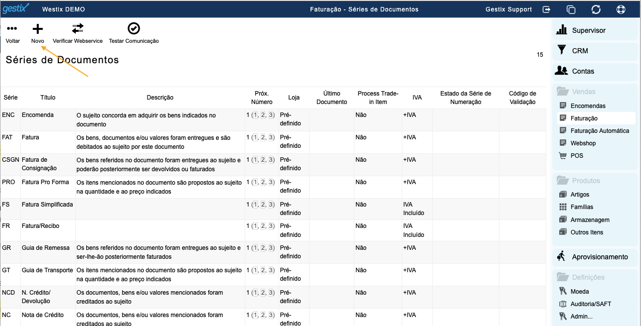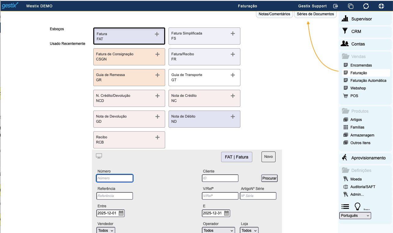 Abrir o menu Séries de Documentos